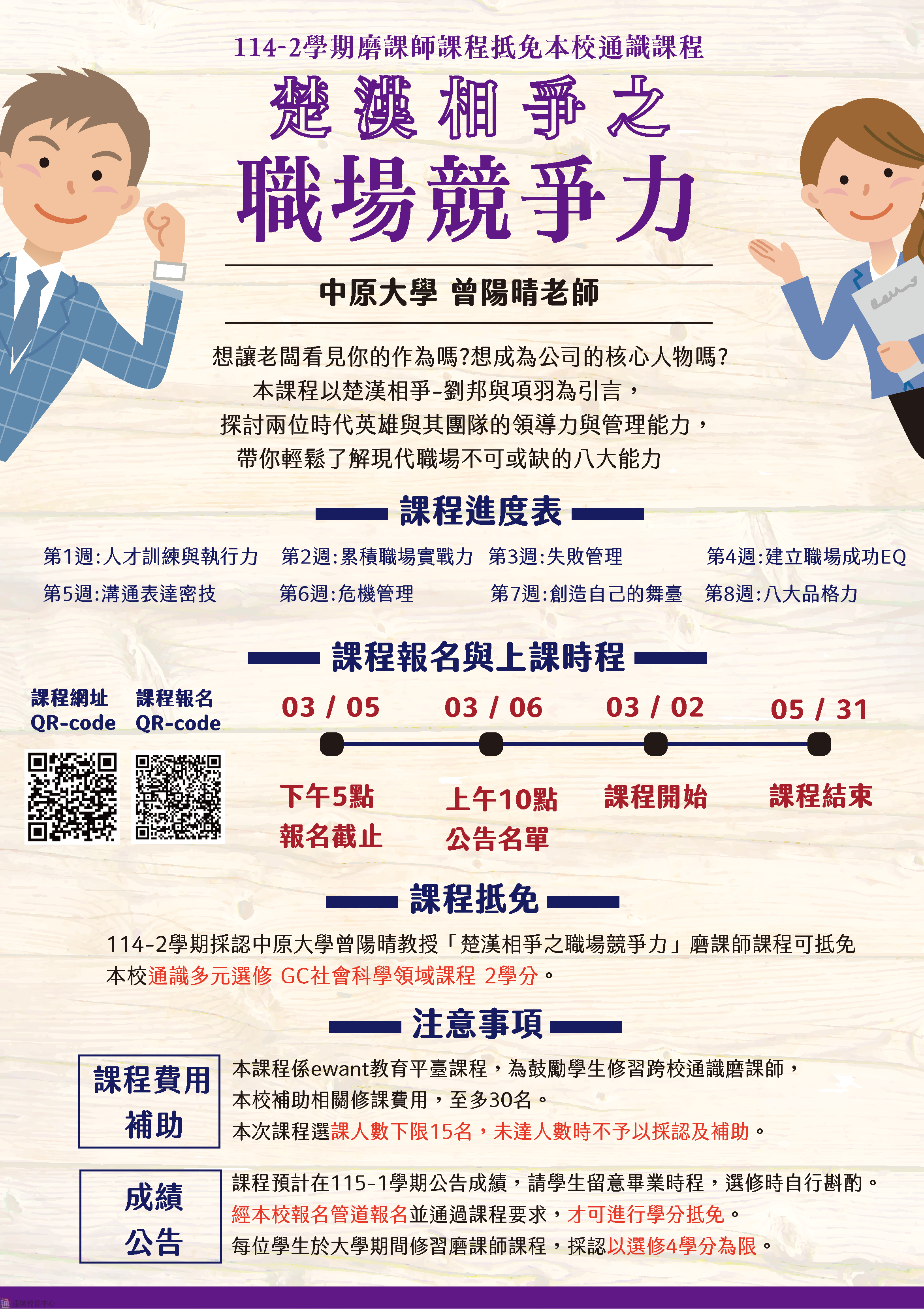 114-2學期補助修習 「楚漢相爭之職場競爭力」磨課師課程 相關認抵、費用等規定事宜